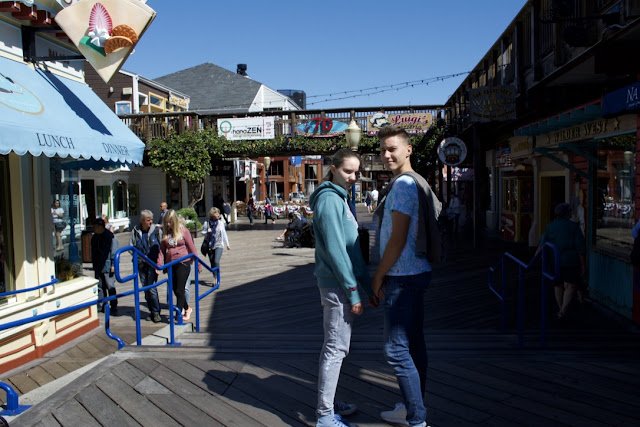 S starim tramvajem smo se odpeljali do Fishersman’s Warf. Vožnja je prav zanimiva, po hribčkih gor in dol. Zanimivo bi bilo, če bi “zavore” popustile. Bilo je kot v filmih, ko vidiš te ulice, ki se dvigajo in spuščajo, ob njih tipične hiške, ena ob drugi. Fischerman’s Warf je glavna turistična atrakcija mesta, ki pa nas ni prepričala. Nekoč ribiški pomoli, danes polno trgovinic in restavracij. Od tukaj je lep razgled na Alcatraz. Morskih levov žal nismo videli. Nas je pa navdušila ulica Lombard – zavita ulica, po kateri se verjetno vozijo le turisti. In teh je res veliko.